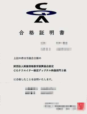 | 2008年 CG-ARTS検定 CGクリエイター エキスパート部門 (旧・デジタル映像部門2級) 取得 |